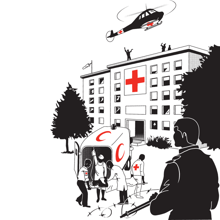 Ortsfeste (z. B. Krankenhäuser), mobile (z. B. Feldlazarette) Sanitätseinrichtungen, Sanitäter und Sanitätstransporte sind unter allen Umständen zu schonen. (Art. 19, 24, 35 I GA I; Art. 12; 21 ZP I; Art. 9 I; 11 ZP II) Dies schließt auch Lazarettschiffe und Sanitätsflugzeuge samt deren Personal ein. (Art. 22, 24, 25, 36, 38, 39 GA II; Art. 22-24 ZP I; Art. 11 ZP II)